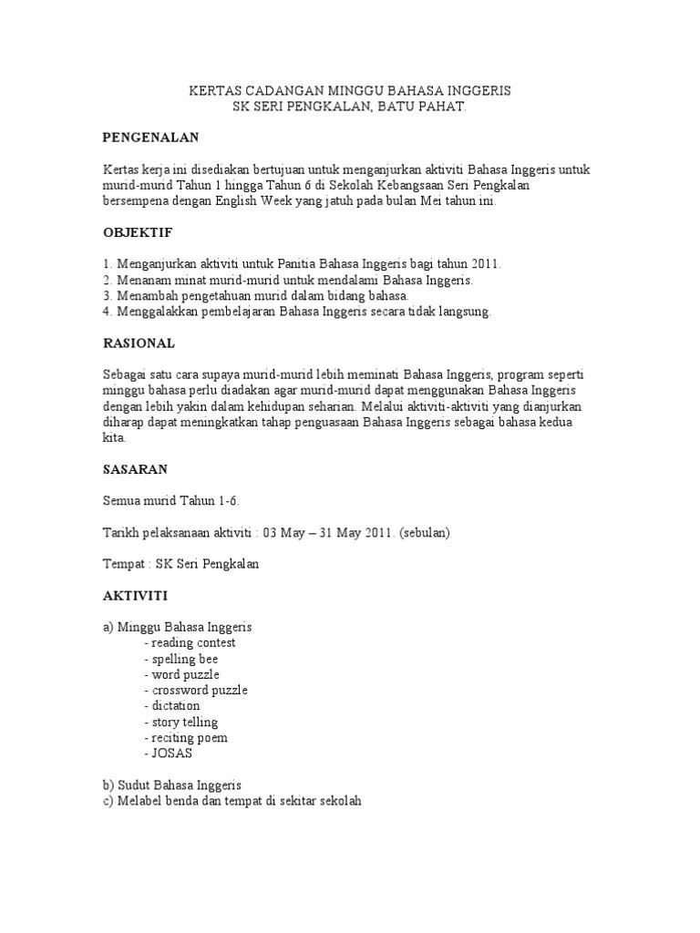 Kertas Kerja English Week Contoh Dan Panduan Pelaksanaan. This is a proposal for activities related to english week for a group of students from 8th grade. Kertas Kerja English Week Contoh Dan Panduan Pelaksanaan Share.